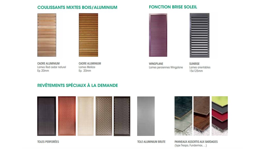Les volets coulissants contribuent à l’esthétique de votre façade, ainsi nous avons développé toute une gamme exclusive, qui allie les matériaux (Bois, Aluminum, matériaux de synthèse), les aspects avec les tôles perforées et les fonctions avec les lames orientables.